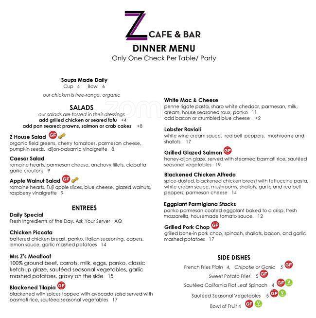 Z Cafe Bar Menu In Oakland California Usa