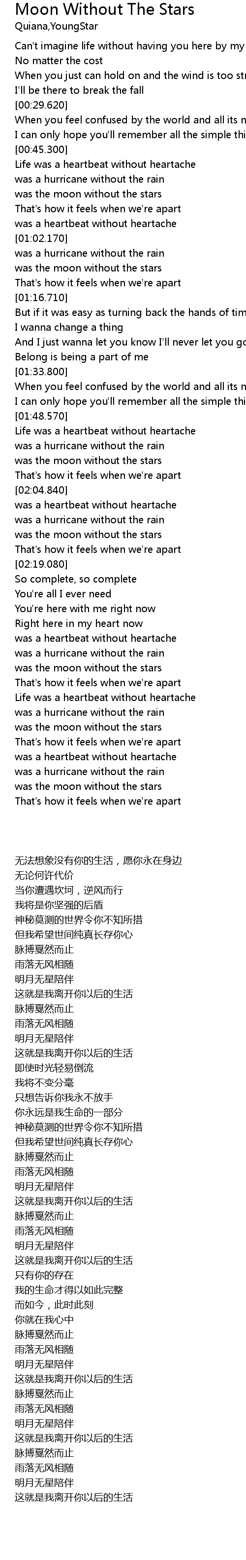 Moon without the stars lyrics. Don t want to live in a world without the moon you know i couldn t make it through the night she needs it to go. I ll give you nights full of passion and days of adventure no strings just warm summer rain and i thought you know i d rather have champagne. Moon without the stars lyrics. What s the moon without the stars.
