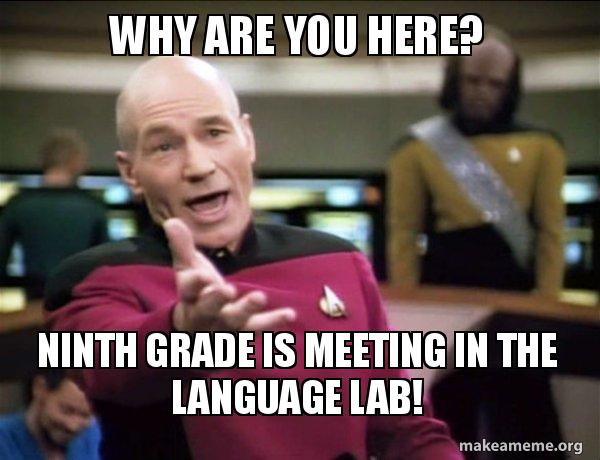 Why Are You Here Ninth Grade Is Meeting In The Language Lab Annoyed Picard Make A Meme